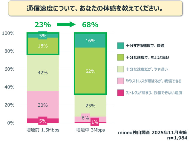 mineoが実施したユーザーアンケートによると、体感速度を「快適」または「ちょうどいい」と答えた人の割合は以下の通りでした。