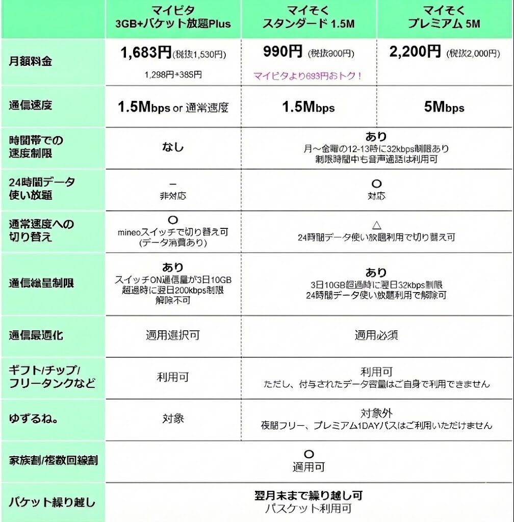 パケット放題plusとマイそく(1.5Mbps)の違い