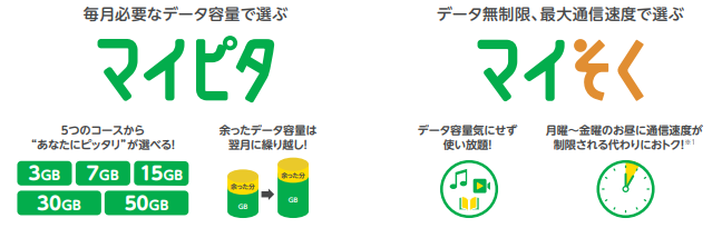 | マイピタ 基本データ容量 | パケット放題Plus | 音声通話+データ通信 (デュアルタイプ) | データ通信のみ (シングルタイプ) |