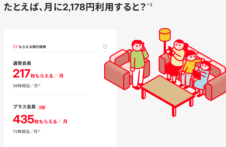 例えば、20GBプランの場合、72株相当(432円)の株引換券が付与され、実質基本料金は1,746円となります。