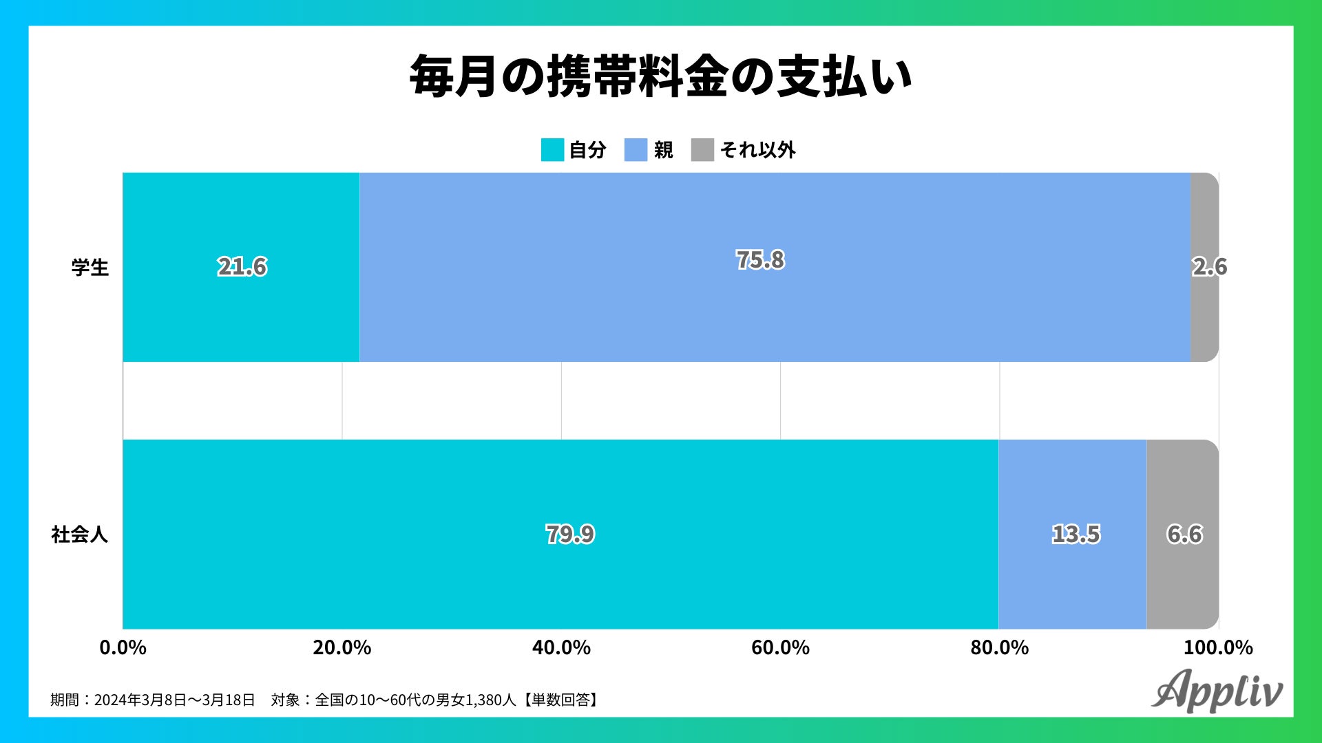 一方で、ある民間企業の調査では、約2割の学生は自分でスマホ代を支払っています。